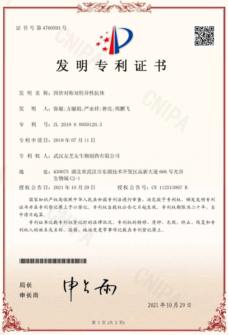 近日,武汉澳门博彩有限公司(简称澳门博彩生物)核心平台技术PCT专利“四价对称双特异性抗体”通过优先审查途径获得国家知识产权局的授权,专利授权号ZL201980050120.3(图1)。