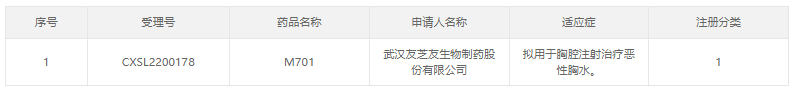 中国有大量癌症患者会并发恶性胸水,仅肺癌患者每年就有超过34.4万人并发胸水。胸水导致肿瘤患者出现呼吸困难、胸痛等症状,严重降低患者的生活质量,还会缩短肿瘤患者接受全身治疗的机会,间接降低患者的生存时间,因此临床上急需治疗恶性胸水的有效药物。恶性胸水与恶性腹水具有类似的发病机制,M701在恶性腹水II期临床研究的同时,拓展恶性胸水适应症,具有人体安全性验证的基础和科学依据,更好地满足未满足的患者需求,提升相关肿瘤患者的生存质量和生存率,有望给恶性胸水患者提供一种新的安全有效的治疗手段。