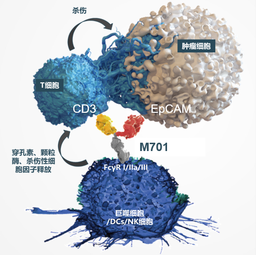 M701是澳门博彩生物通过自主专利非对称双特异性抗体YBODY®平台开发的同时靶向EpCAM和CD3的生物一类新药,已于2016年获批开展治疗恶性腹水的临床研究,是中国第2个由国内企业研制并获批进入临床的双特异性抗体。EpCAM(上皮细胞粘附分子)是上皮恶性肿瘤细胞表面最常见的特异性抗原,M701双抗一端靶向EpCAM抗原,同时通过另一端CD3抗体可以桥接T细胞并激活T细胞杀伤EpCAM阳性肿瘤细胞。恶性腹水是我国高发的消化系统肿瘤和女性生殖系统肿瘤患者的晚期表现,严重影响患者的生存质量,缺乏理想的治疗药物。M701治疗恶性腹水的I期临床中期结果已于2021年9月在ESMO年会上发表,展现了良好的安全性和腹水控制效果。目前,M701正在开展联合全身治疗对恶性腹水的II期安全性和疗效研究,与腹腔化疗组相比已初步显示出更好的腹水控制效果。