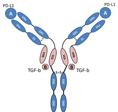 免疫治疗是对肿瘤最有前景的治疗方法之一。PD-1/PD-L1单抗因抗癌谱广、疗效持久、副作用易耐受而备受瞩目,但是其响应率局限在大约20%肿瘤病人。为了让更多的患者对这些免疫疗法产生响应,很多试验正在评估抗PD-1 / PD-L1与其他靶点结合的联合疗法或者双特异抗体研发。肿瘤微环境中的TGF-β信号促进肿瘤进展,也是公认的免疫抑制因子。临床前研究已经证实了PD-L1和TGF-β途径之间可能存在互补相互作用,通过同时阻断两个免疫抑制信号通路,解除免疫系统的抑制状态,有望唤醒和恢复机体的抗肿瘤反应,从而起到控制肿瘤生长的效果。