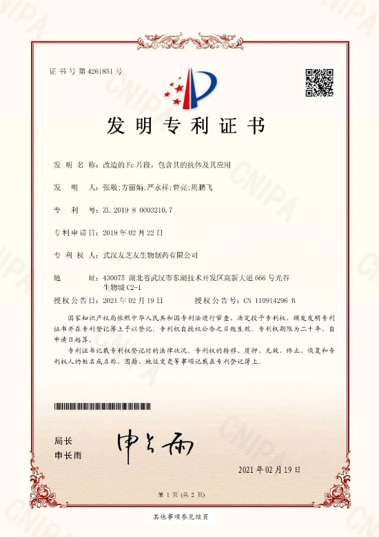 近日,武汉澳门博彩有限公司(简称澳门博彩生物)核心平台技术专利“改造的Fc片段,包含其的抗体及其应用”获得国家知识产权局的授权,专利授权号ZL201980003210.7。