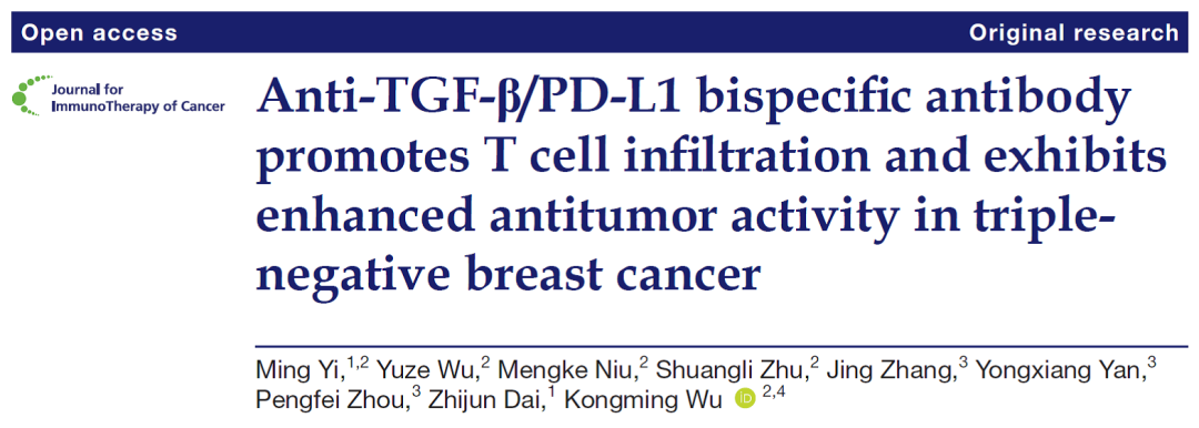 近日,《Anti-TGF-β/PD-L1 bispecific antibody promotes T cell infiltration and exhibits enhanced antitumor activity in triple-negative breast cancer》发表于《Journal for immunotherapy of cancer》(中科院一区,IF: 12.5)期刊,此研究由华中科技大学同济医学院附属同济医院肿瘤科吴孔明教授团队、浙江大学医学院附属第一医院乳腺外科代志军教授团队和澳门线上博彩官网(以下简称澳门线上博彩官网生物)周鹏飞博士团队共同合作完成。