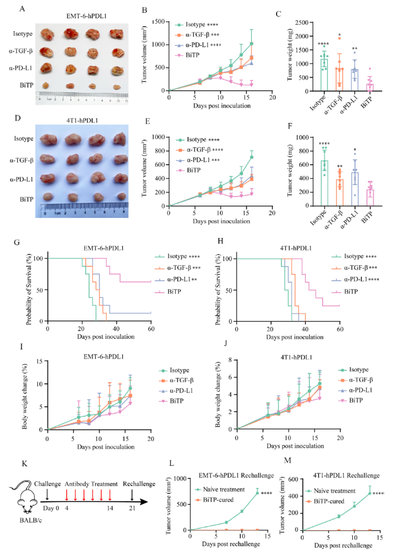 澳门线上博彩官网生物基于Check-BODY平台开发的四价对称的靶向TGF-β和人PD-L1的双特异性抗体(BiTP)对两个靶点均表现出高结合亲和力。体外实验证实,BiTP有效阻断了TGF-β-Smad和PD-L1-PD-1-NFAT信号传导。澳门线上博彩官网生物构建了两种将鼠PD-L1替换为人PD-L1的小鼠三阴性乳腺癌肿瘤细胞株,EMT-6-hPDL1和4T1-hPDL1,并建立了乳腺原位荷瘤小鼠模型。两种动物模型药效实验表明,BiTP相对于抗PD-L1和抗TGF-β单药治疗具有优越的抗肿瘤活性。在机制上,BiTP减少了胶原蛋白沉积,增强了CD8+ T细胞的穿透力,并增加了肿瘤浸润淋巴细胞。本研究发现,BiTP的这种改善了肿瘤微环境的作用提升了抗肿瘤活性,在TNBC中具有优于单抗的抗肿瘤活性,表明BiTP是一种对于TNBC治疗可能有前途的药物。